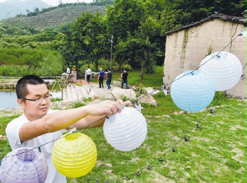 近日,新昌县沙溪镇生田村内,海归硕士毕业生团队,把农村闲置房改造成以旅游文化为特色的实验室综合体,成为新昌首个海归人才闲置房激活案例。图为海归硕士在装扮草坪灯。